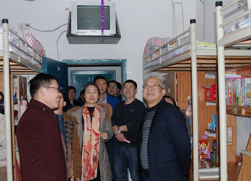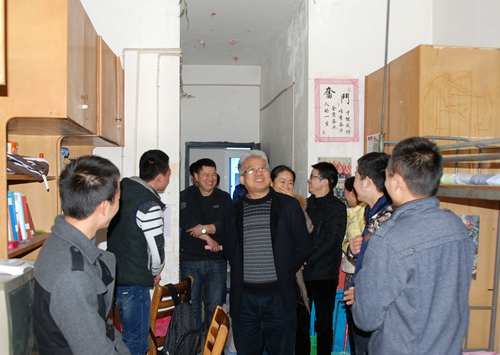 汪立夏仔細察看宿舍物品有無損壞、宿舍衛生、采光、陽臺環境和室內布置等情況,就優化宿舍環境、創建寢室文化提出看法并與學生一起探討。在3棟二單元女生宿舍,汪立夏還翻看了一位女生擺放在書架上的書籍,提出了關于看書的建議。在14 棟男生宿舍,他鼓勵工科生多培養人文素養。