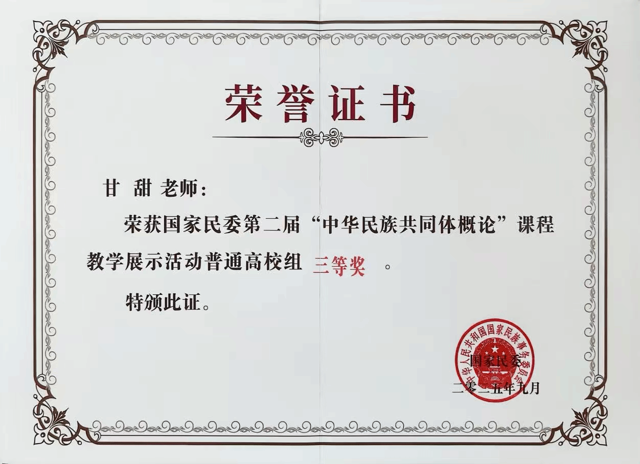 9月17日至19日,由國家民委舉辦的第二屆“中華民族共同體概論”課程教學現場展示活動在中南民族大學舉行。我校馬克思主義學院教師甘甜參賽,并獲得普通高校組三等獎。