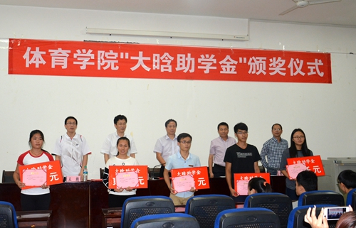 6月4日,體育學院舉行首屆“大晗助學金”頒獎儀式,體育學院10名貧困學生獲獎。副校長張玉清及助學金設立者陳大晗、體育學院負責人出席。體育學院黨委書記陽國誠宣讀 “大晗助學金”獲得者名單。