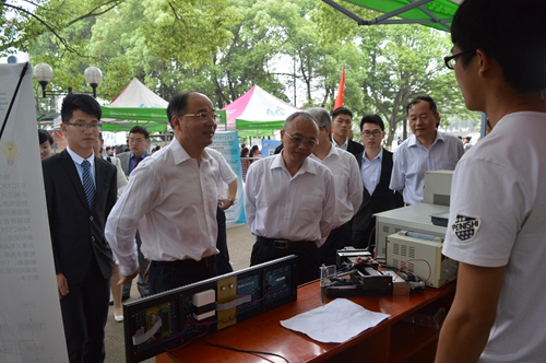 “你的產品和市場上同類產品有什么競爭優勢?它的創新在哪里?”校黨委書記萬明在機電學院科技文化展展臺前詢問現場講解的同學。5月4日,機電學院第二屆迎“五四”系列科技文化展在學思路舉行。校黨委書記萬明、校黨委副書記汪立夏、副校長陳夢成參觀了展覽。