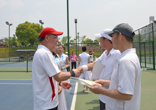 本屆全省領(lǐng)導(dǎo)干部網(wǎng)球邀請(qǐng)賽由我校與省網(wǎng)球協(xié)會(huì)主辦,我校體育學(xué)院承辦,共吸引80余位領(lǐng)導(dǎo)干部參賽。我校黨委書記萬明、省體育局副局長周海濤組合斬獲男子甲組雙打亞軍。(攝影/薛桂君)