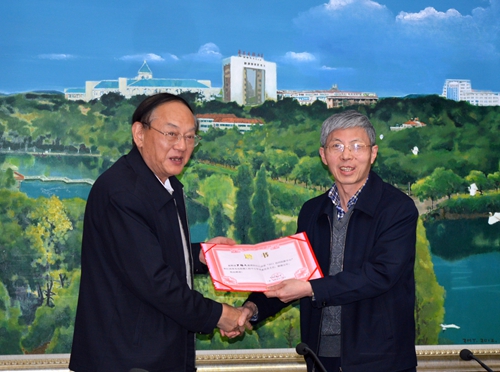 校長雷曉燕為羅錫文院士頒發“2011協同創新中心”學術委員會暨江西省光電檢測工程中心學術委員會主任聘書。