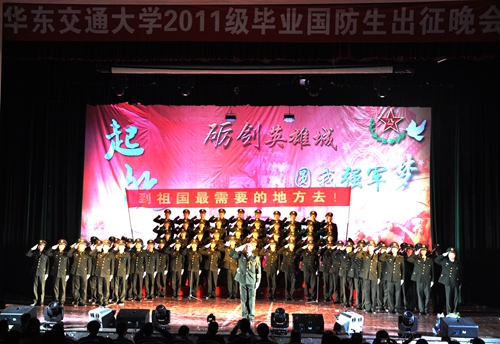 “礪劍英雄城,圓我強軍夢”3月28日晚,2011級國防生“起航”出征晚會在南區禮堂舉行。“忠誠于黨,報效國家,熱愛人民”,2011級國防生的錚錚誓言響徹禮堂。綠色軍姿,炫舞宏歌,燃情上演。