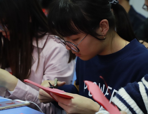 “在課堂上學(xué)習(xí)剪紙這種民間藝術(shù)很有趣,這個課程讓我們感受到了傳統(tǒng)藝術(shù)的魅力,同時也學(xué)到了一些簡單的手工藝術(shù)技巧,這對以后的對外漢語教學(xué)很有意義。我們將在教學(xué)中進(jìn)一步傳播、傳承中華傳統(tǒng)藝術(shù)。”2014級漢語國際教育專業(yè)的馮肖肖說。
