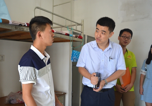 新生們正在宿舍收拾整理行李,打掃衛(wèi)生。趙軍輝詳細詢問同學們的住宿和生活情況,希望大家把學校當成自己的家,互相關愛,學會獨立生活和自主學習,努力提高綜合素質,全面發(fā)展。