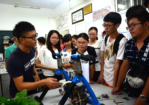 走進通信電子實驗基地,新生瞬間被各種新奇作品所吸引。“這個作品《多功能智能澆花裝置》于今年6月榮獲江西省計算機作品賽特等獎呢……”邊看邊聊,現(xiàn)場氛圍十分熱鬧。