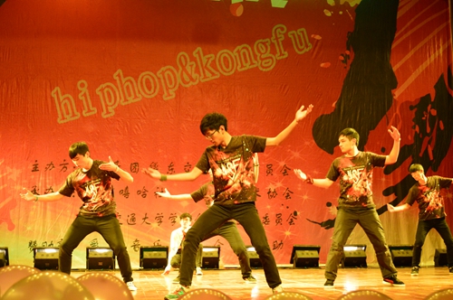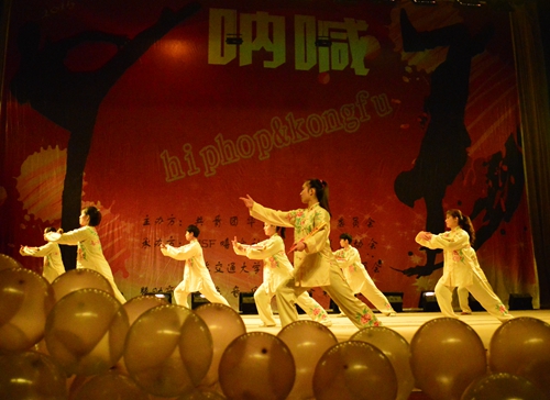 我校NSF嘻哈社帶來的《精武霍元甲》出拳踢腿剛勁有力,吶喊聲慷慨激昂,全場熱血沸騰。《舞加舞》節目亦是熱情四射,舞者配合默契,舞蹈動感。我校武術協會的武術串燒《魂》更是上演了一場行云流水的太極以及刀、槍、棍的表演,展現出中華武術剛柔并濟之精華。刀槍對打、鞭聲呼嘯,精彩紛呈,引來一片叫好之聲,現場氣氛一度升溫。