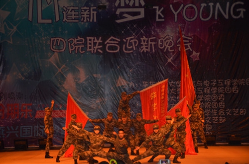 颯爽軍姿,不屈軍武。信息學院國防生在舞臺上演繹了一場熱血澎湃的《軍武》,打拳揮旗、演刀亮劍,整齊的軍體拳贏得全場掌聲雷動。全省大學生心理劇一等獎隊伍精心演繹《我是演員之偶像團》,詼諧幽默的言語,夸張的動作,觀眾笑聲此起彼伏。一曲《青春修煉手冊》配上小丑打扮的小人服飾,電氣學院帶來的小人舞《小人族的青春狂想曲》以獨具創意的演繹方式讓人耳目一新。體育學院獨特的武術表演將晚會推向高潮,漂亮的后空翻、剛猛的拳術、炫酷的槍藝、棍棒掌法一氣呵成。