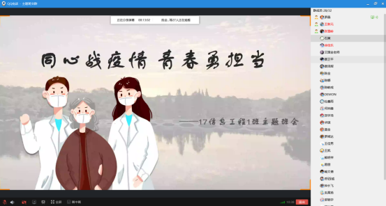 17級通信卓越1班班長劉文杰通過視頻短片,引領大家共同回顧了在過去一個多月中,全國上下一心共抗疫情的感人場景,視頻中的“中國力量”“中國速度”“中國擔當”給同學們留下了深刻的印象。