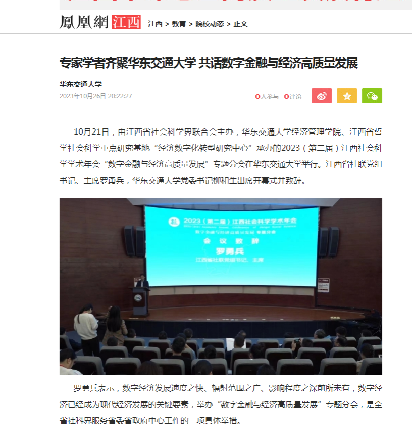10月21日,由江西省社會科學界聯合會主辦,華東交通大學經濟管理學院、江西省哲學社會科學重點研究基地“經濟數字化轉型研究中心”承辦的2023(第二屆)江西社會科學學術年會“數字金融與經濟高質量發展”專題分會在華東交通大學舉行。江西省社聯黨組書記、主席羅勇兵,華東交通大學黨委書記柳和生出席開幕式并致辭。