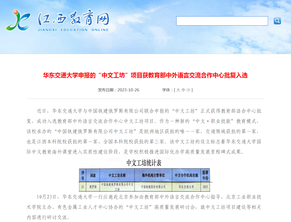 近日,華東交通大學(xué)與中國(guó)鐵建俄羅斯有限公司聯(lián)合申報(bào)的“中文工坊”正式獲得教育部語(yǔ)合中心批復(fù),成功入選教育部中外語(yǔ)言交流合作中心中文工坊項(xiàng)目。作為一種新的“中文+職業(yè)技能”教育模式,該校承辦的“中國(guó)鐵建俄羅斯有限公司中文工坊”是歐洲地區(qū)獲批的唯一一家,交通領(lǐng)域獲批的第一家,也是江西本科院校獲批的第一家、全國(guó)本科院校獲批的第三家。該中文工坊的設(shè)立標(biāo)志著華東交通大學(xué)國(guó)際中文教育海外課堂進(jìn)入實(shí)質(zhì)性建設(shè)階段,是學(xué)校積極推進(jìn)國(guó)際化辦學(xué)高質(zhì)量發(fā)展里程碑式成果。