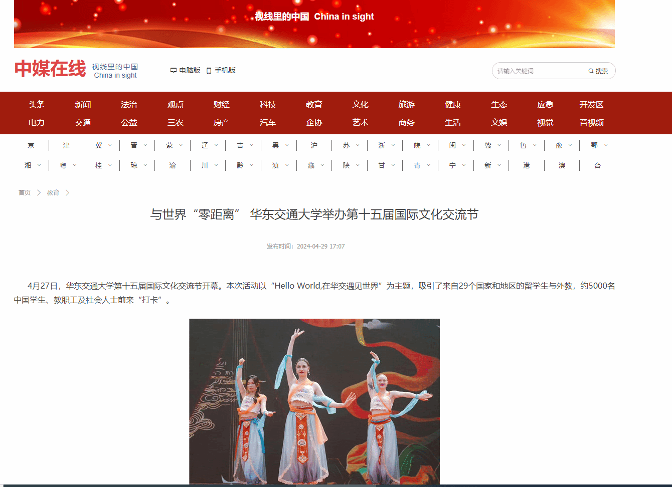 4月27日,華東交通大學第十五屆國際文化交流節開幕。本次活動以“Hello World,在華交遇見世界”為主題,吸引了來自29個國家和地區的留學生與外教,約5000名中國學生、教職工及社會人士前來“打卡”。