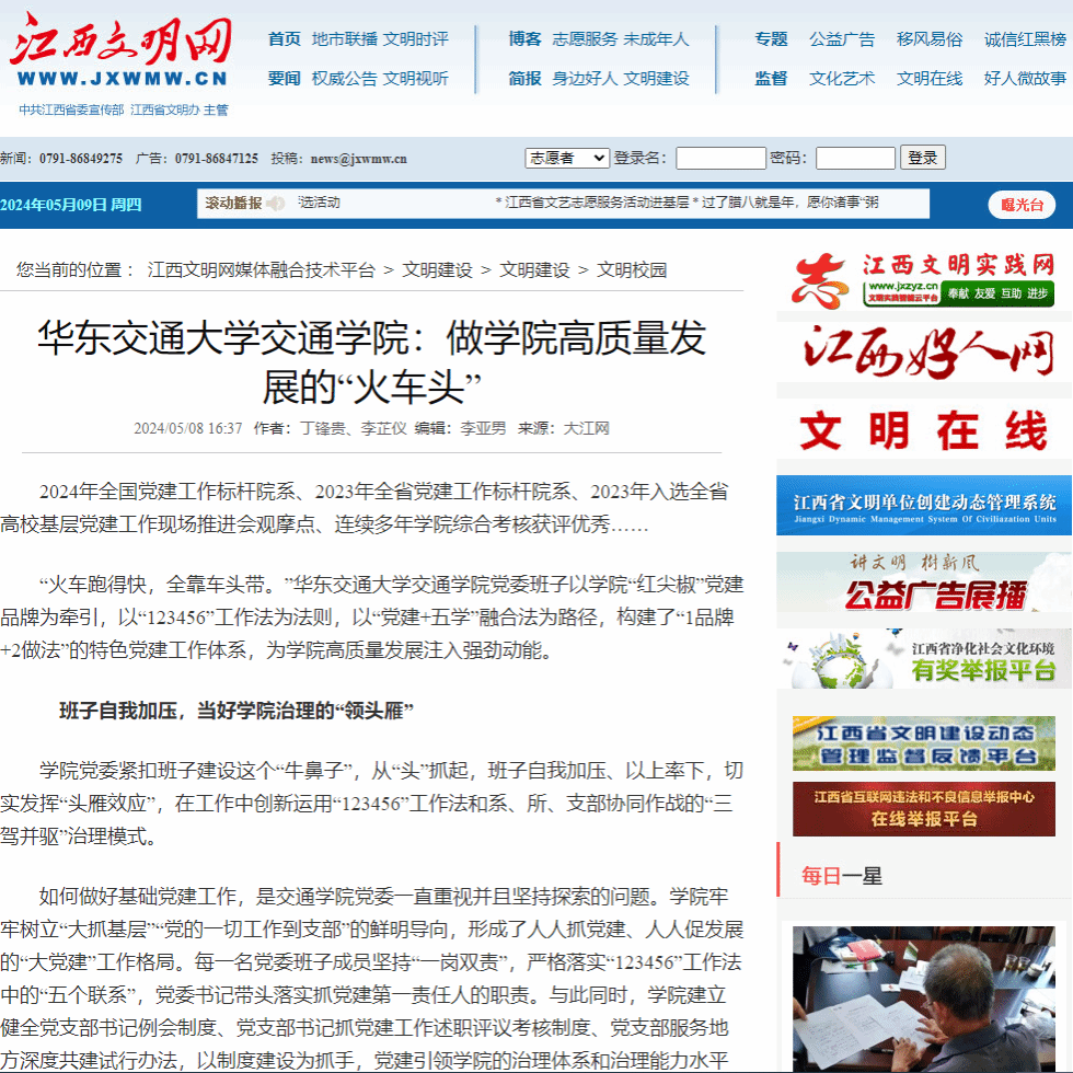 辦大學就是辦學科。學院黨委始終堅持以一流黨建引領一流學科發展,黨委會和黨政聯席會議經常研究學科建設事宜。學院黨委成立沖擊國家“雙一流”學科突擊隊黨支部,動員各研究所黨員教師帶頭勇挑重擔,鍛長板、補短板、固底板、樹樣板,持續發力。交通運輸工程學科帶頭人申報的國家重點研發計劃重點專項“鐵路基礎設施智能建造質量控制關鍵技術”項目獲批,形成了推進科技創新的強大合力。學院黨委鼓勵黨員教師積極服務地方經濟社會發展,助力“交通強省”建設,首次承擔中國工程院戰略研究與咨詢重大項目“江西省水路交通發展戰略研究”的兩個子課題并順利通過綜合績效評價,出版發布全國首部以交通強省建設為主題的藍皮書。交通運輸工程學科也入選江西省一流學科(高峰優勢學科),在全省一流學科考核中連續獲評優秀,在第五輪學科評估中跨擋升級,入選了2023軟科“中國最好學科”的前20%。