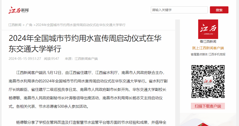 5月12日,由江西省住建廳、江西省水利廳、南昌市人民政府聯合主辦,南昌市水利局承辦的2024年全國城市節約用水宣傳周啟動儀式在華東交通大學舉行。省水利廳副廳長姚毅臣、省住建廳二級巡視員李日龍、南昌市人民政府副市長彭開先、華東交通大學副校長楊德敏、南昌市人民政府副秘書長葉濤等領導出席活動,南昌市水利局局長楊志文主持啟動儀式。各相關代表、節水志愿者500余人參加活動。