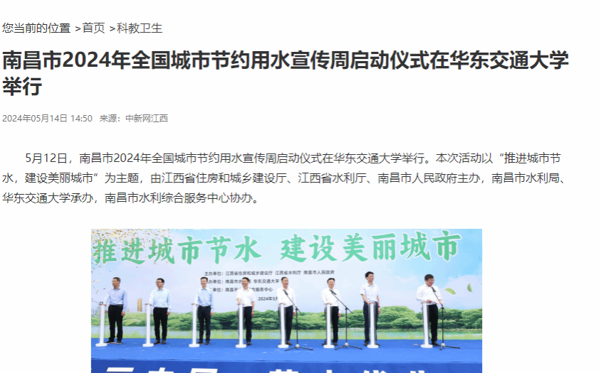 5月12日,南昌市2024年全國城市節約用水宣傳周啟動儀式在華東交通大學舉行。本次活動以“推進城市節水,建設美麗城市”為主題,由江西省住房和城鄉建設廳、江西省水利廳、南昌市人民政府主辦,南昌市水利局、華東交通大學承辦,南昌市水利綜合服務中心協辦。