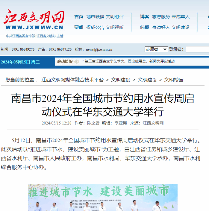5月12日,南昌市2024年全國城市節約用水宣傳周啟動儀式在華東交通大學舉行。此次活動以“推進城市節水,建設美麗城市”為主題,由江西省住房和城鄉建設廳、江西省水利廳、南昌市人民政府主辦,南昌市水利局、華東交通大學承辦,南昌市水利綜合服務中心協辦。