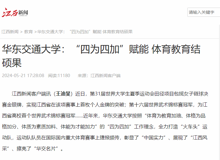 近日,第31屆世界大學(xué)生夏季運(yùn)動會田徑項(xiàng)目包攬女子鏈球決賽金銀牌,實(shí)現(xiàn)江西省在該項(xiàng)賽事上首枚個人金牌的突破;第十六屆世界武術(shù)錦標(biāo)賽冠軍,為江西省高校首個世界武術(shù)錦標(biāo)賽冠軍……近年來,華東交通大學(xué)按照“體育為教育加油、體格為品格加分、體質(zhì)為素質(zhì)加料、體能為才能加力”的“四為四加”工作理念,全力打造“火車頭”運(yùn)動隊(duì),運(yùn)動隊(duì)隊(duì)員在國際國內(nèi)重大體育賽事上捷報頻傳,彰顯了“中國實(shí)力”、展現(xiàn)了“江西風(fēng)采”、擦亮了“華交名片”。