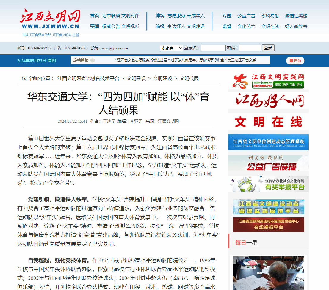 第31屆世界大學(xué)生夏季運動會包攬女子鏈球決賽金銀牌,實現(xiàn)江西省在該項賽事上首枚個人金牌的突破;第十六屆世界武術(shù)錦標(biāo)賽冠軍,為江西省高校首個世界武術(shù)錦標(biāo)賽冠軍……近年來,華東交通大學(xué)按照“體育為教育加油、體格為品格加分、體質(zhì)為素質(zhì)加料、體能為才能加力”的“四為四加”工作理念,全力打造“火車頭”運動隊,運動隊隊員在國際國內(nèi)重大體育賽事上捷報頻傳,彰顯了“中國實力”、展現(xiàn)了“江西風(fēng)采”、擦亮了“華交名片”。