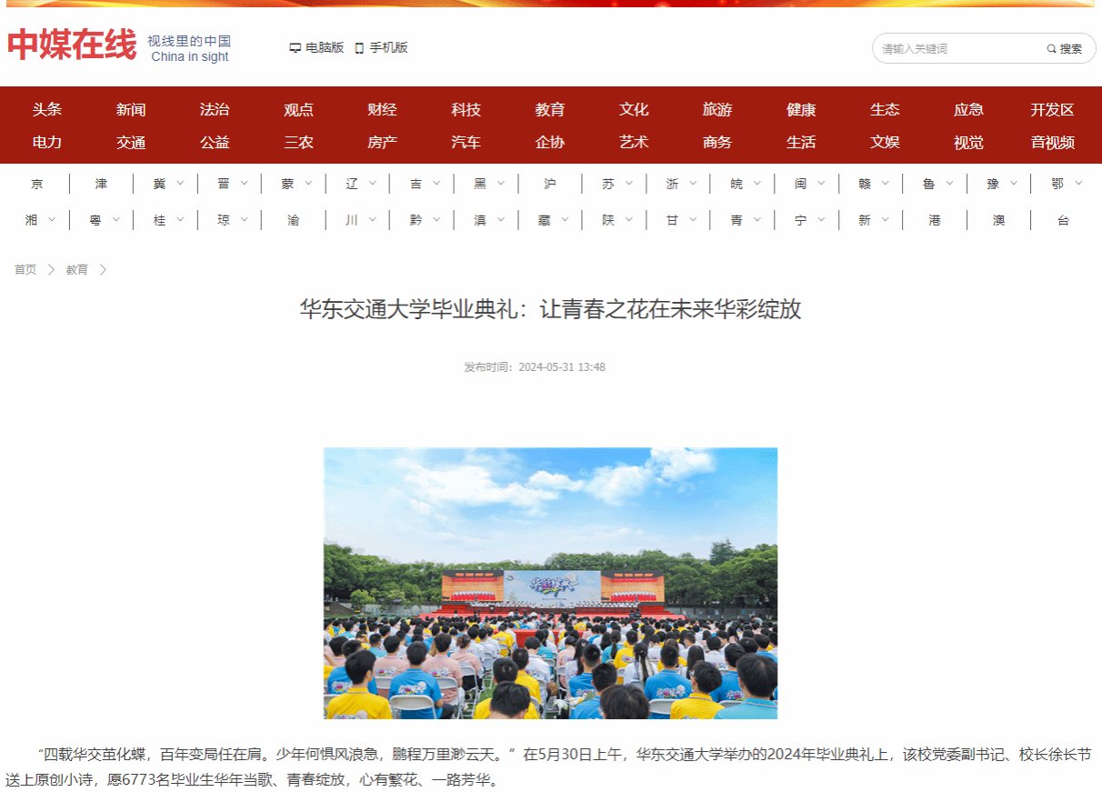 “四載華交繭化蝶,百年變局任在肩。少年何懼風浪急,鵬程萬里渺云天。”在5月30日上午,華東交通大學舉辦的2024年畢業典禮上,該校黨委副書記、校長徐長節送上原創小詩,愿6773名畢業生華年當歌、青春綻放,心有繁花、一路芳華。