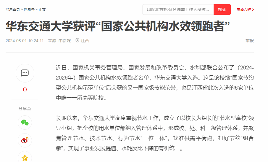 近日,國家機關事務管理局、國家發展和改革委員會、水利部聯合公布了(2024-2026年)國家公共機構水效領跑者名單,華東交通大學入選。這是該校繼“國家節約型公共機構示范單位”后榮獲的又一國家級節能榮譽,也是江西省此次入選的6家單位中唯一一所高等院校。