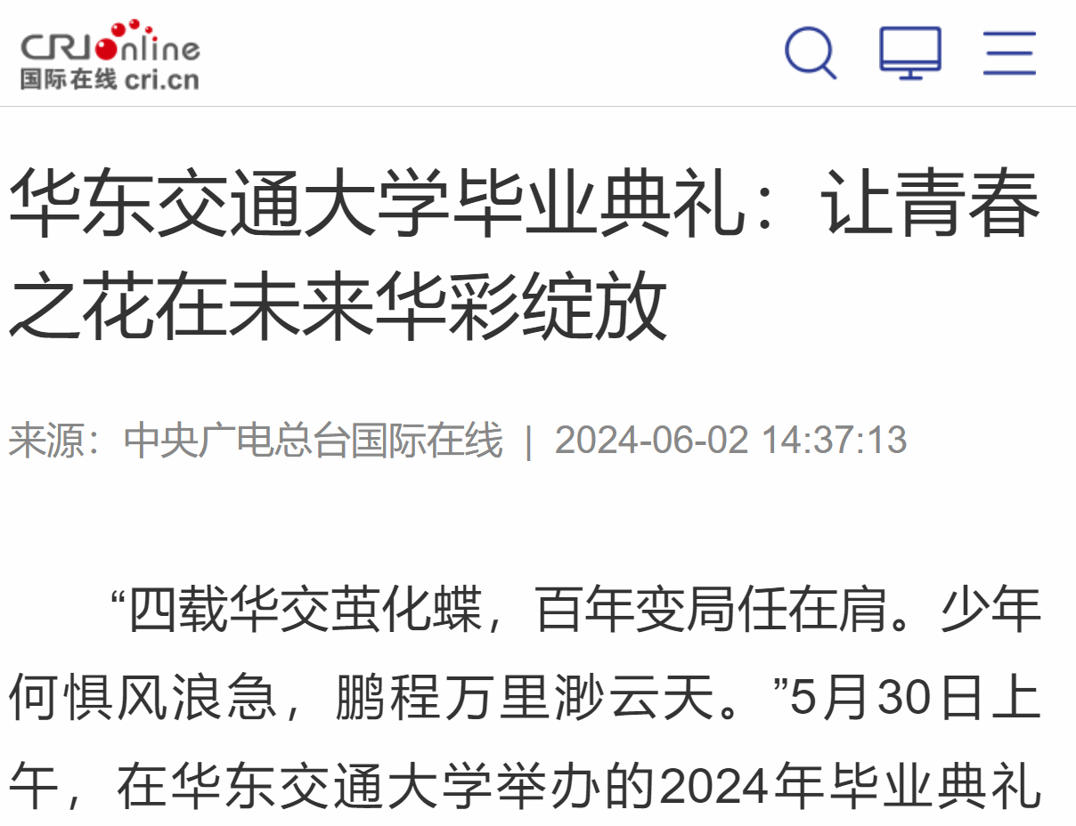 “四載華交繭化蝶,百年變局任在肩。少年何懼風浪急,鵬程萬里渺云天。”5月30日上午,在華東交通大學舉辦的2024年畢業典禮上,該校黨委副書記、校長徐長節送上原創小詩,愿6773名畢業生華年當歌、青春綻放,心有繁花、一路芳華。