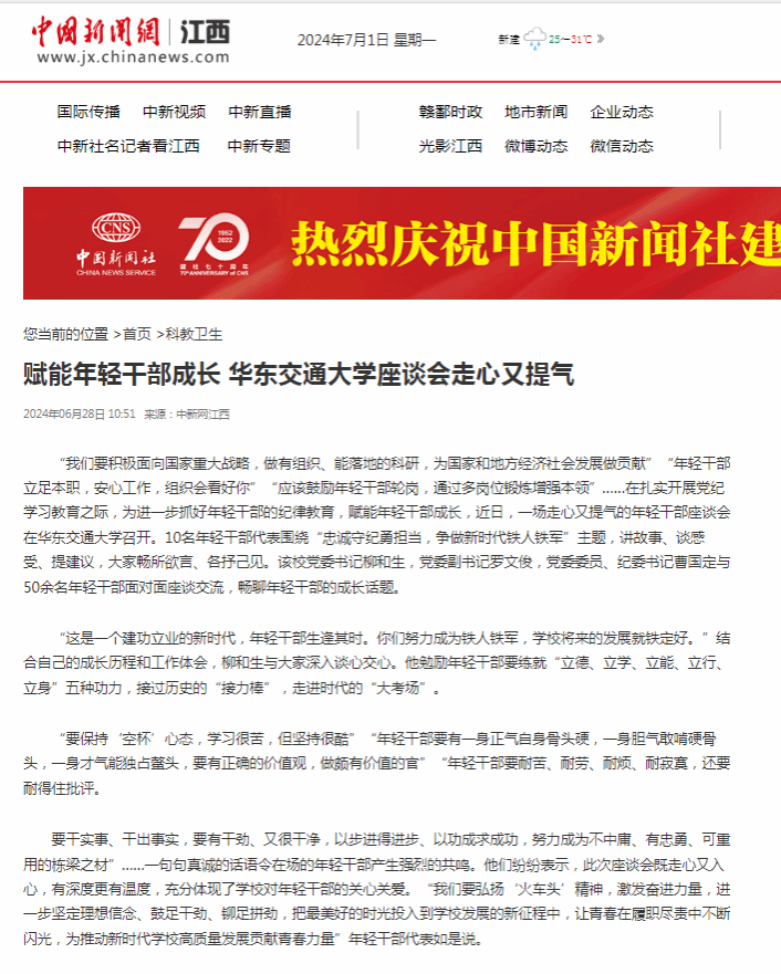 “我們要積極面向國家重大戰略,做有組織、能落地的科研,為國家和地方經濟社會發展做貢獻”“年輕干部立足本職,安心工作,組織會看好你”“應該鼓勵年輕干部輪崗,通過多崗位鍛煉增強本領”……在扎實開展黨紀學習教育之際,為進一步抓好年輕干部的紀律教育,賦能年輕干部成長,近日,一場走心又提氣的年輕干部座談會在華東交通大學召開。10名年輕干部代表圍繞“忠誠守紀勇擔當,爭做新時代鐵人鐵軍”主題,講故事、談感受、提建議,大家暢所欲言、各抒己見。該校黨委書記柳和生,黨委副書記羅文俊,黨委委員、紀委書記曹國定與50余名年輕干部面對面座談交流,暢聊年輕干部的成長話題。