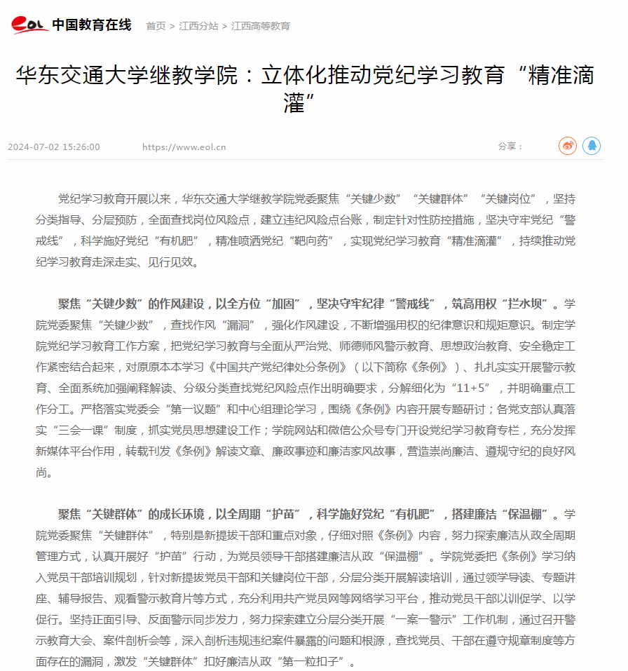 黨紀學習教育開展以來,華東交通大學繼教學院黨委聚焦“關鍵少數”“關鍵群體”“關鍵崗位”,堅持分類指導、分層預防,全面查找崗位風險點,建立違紀風險點臺賬,制定針對性防控措施,堅決守牢黨紀“警戒線”,科學施好黨紀“有機肥”,精準噴灑黨紀“靶向藥”,實現黨紀學習教育“精準滴灌”,持續推動黨紀學習教育走深走實、見行見效。