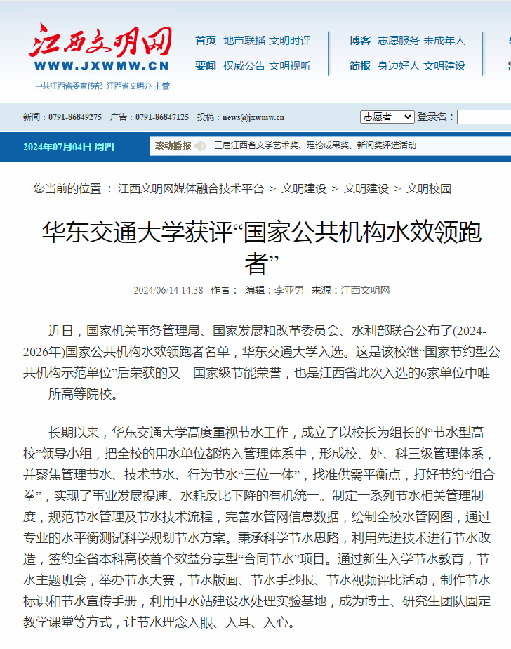 近日,國家機關(guān)事務管理局、國家發(fā)展和改革委員會、水利部聯(lián)合公布了(2024-2026年)國家公共機構(gòu)水效領(lǐng)跑者名單,華東交通大學入選。這是該校繼“國家節(jié)約型公共機構(gòu)示范單位”后榮獲的又一國家級節(jié)能榮譽,也是江西省此次入選的6家單位中唯一一所高等院校。