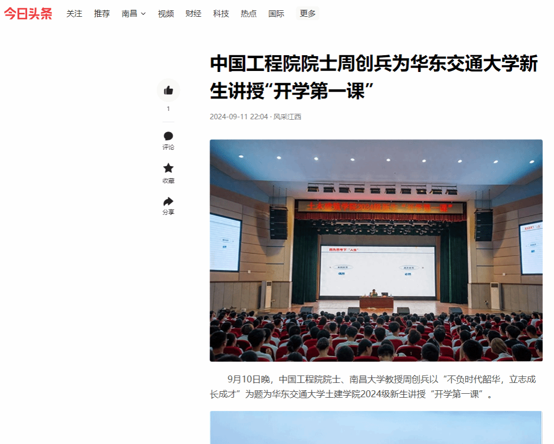9月10日晚,中國工程院院士、南昌大學教授周創兵以“不負時代韶華,立志成長成才”為題為華東交通大學土建學院2024級新生講授“開學第一課”。