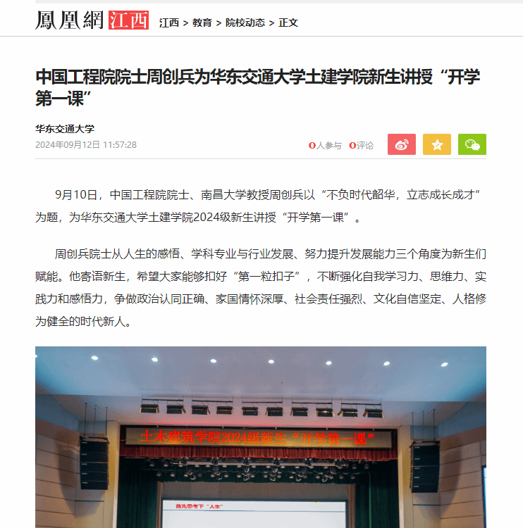 9月10日,中國(guó)工程院院士、南昌大學(xué)教授周創(chuàng)兵以“不負(fù)時(shí)代韶華,立志成長(zhǎng)成才”為題,為華東交通大學(xué)土建學(xué)院2024級(jí)新生講授“開學(xué)第一課”。