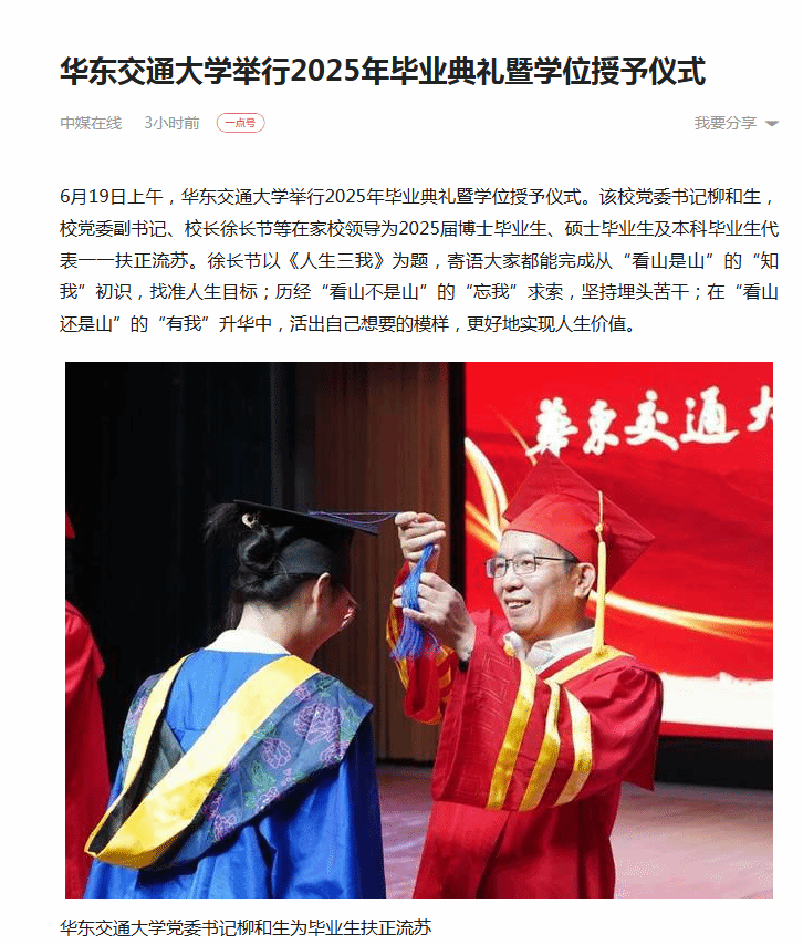 6月19日上午,華東交通大學舉行2025年畢業典禮暨學位授予儀式。該校黨委書記柳和生,校黨委副書記、校長徐長節等在家校領導為2025屆博士畢業生、碩士畢業生及本科畢業生代表一一扶正流蘇。徐長節以《人生三我》為題,寄語大家都能完成從“看山是山”的“知我”初識,找準人生目標;歷經“看山不是山”的“忘我”求索,堅持埋頭苦干;在“看山還是山”的“有我”升華中,活出自己想要的模樣,更好地實現人生價值。
