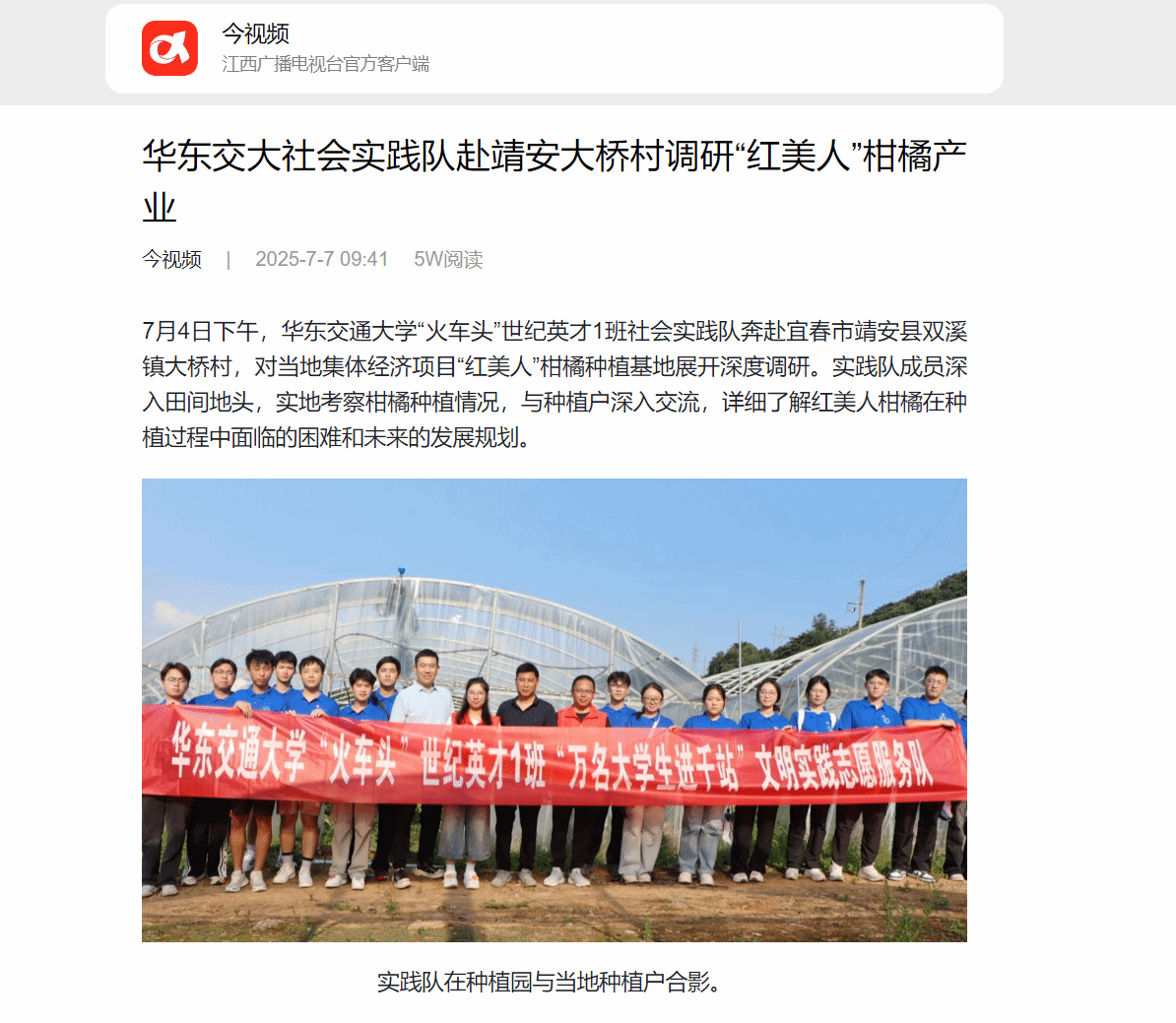 7月4日下午,華東交通大學“火車頭”世紀英才1班社會實踐隊奔赴宜春市靖安縣雙溪鎮大橋村,對當地集體經濟項目“紅美人”柑橘種植基地展開深度調研。實踐隊成員深入田間地頭,實地考察柑橘種植情況,與種植戶深入交流,詳細了解紅美人柑橘在種植過程中面臨的困難和未來的發展規劃。