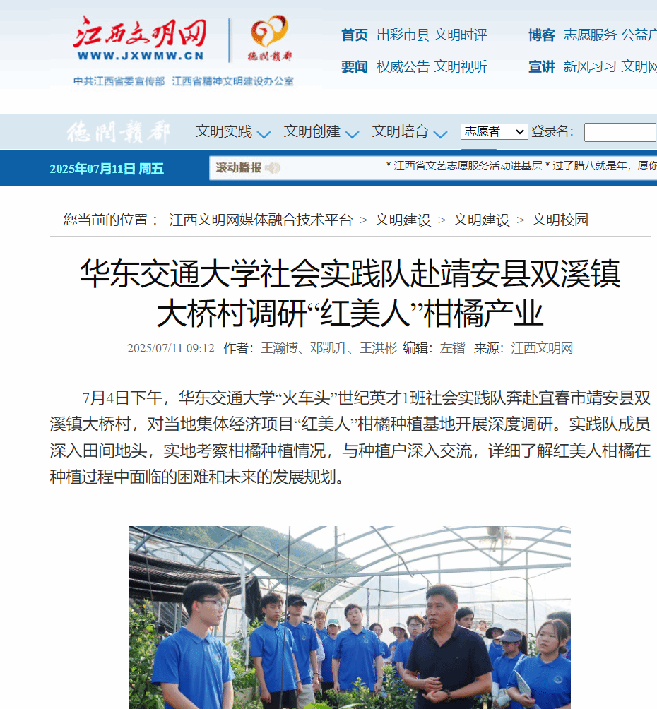 7月4日下午,華東交通大學(xué)“火車頭”世紀(jì)英才1班社會實踐隊奔赴宜春市靖安縣雙溪鎮(zhèn)大橋村,對當(dāng)?shù)丶w經(jīng)濟項目“紅美人”柑橘種植基地開展深度調(diào)研。實踐隊成員深入田間地頭,實地考察柑橘種植情況,與種植戶深入交流,詳細(xì)了解紅美人柑橘在種植過程中面臨的困難和未來的發(fā)展規(guī)劃。