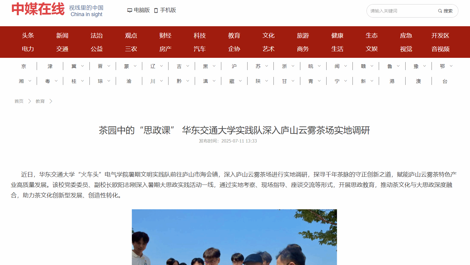 近日,華東交通大學“火車頭”電氣學院暑期文明實踐隊前往廬山市海會鎮(zhèn),深入廬山云霧茶場進行實地調(diào)研,探尋千年茶脈的守正創(chuàng)新之道,賦能廬山云霧茶特色產(chǎn)業(yè)高質(zhì)量發(fā)展。該校黨委委員、副校長歐陽志剛深入暑期大思政實踐活動一線,通過實地考察、現(xiàn)場指導、座談交流等形式,開展思政教育,推動茶文化與大思政深度融合,助力茶文化創(chuàng)新型發(fā)展、創(chuàng)造性轉(zhuǎn)化。