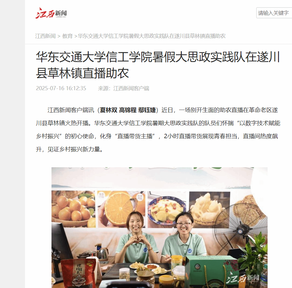 近日,一場別開生面的助農直播在革命老區遂川縣草林鎮火熱開播。華東交通大學信工學院暑期大思政實踐隊的隊員們懷揣“以數字技術賦能鄉村振興”的初心使命,化身“直播帶貨主播”,2小時直播帶貨展現青春擔當,直播間熱度飆升,見證鄉村振興新力量。