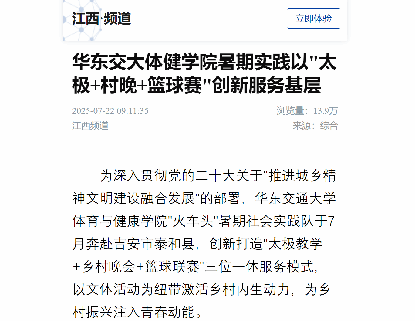 為深入貫徹黨的二十大關于"推進城鄉精神文明建設融合發展"的部署,華東交通大學體育與健康學院"火車頭"暑期社會實踐隊于7月奔赴吉安市泰和縣,創新打造"太極教學+鄉村晚會+籃球聯賽"三位一體服務模式,以文體活動為紐帶激活鄉村內生動力,為鄉村振興注入青春動能。