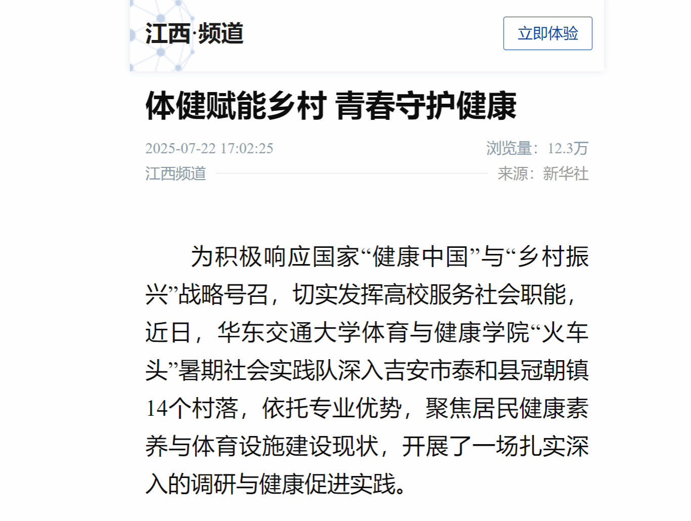 為積極響應國家“健康中國”與“鄉村振興”戰略號召,切實發揮高校服務社會職能,近日,華東交通大學體育與健康學院“火車頭”暑期社會實踐隊深入吉安市泰和縣冠朝鎮14個村落,依托專業優勢,聚焦居民健康素養與體育設施建設現狀,開展了一場扎實深入的調研與健康促進實踐。