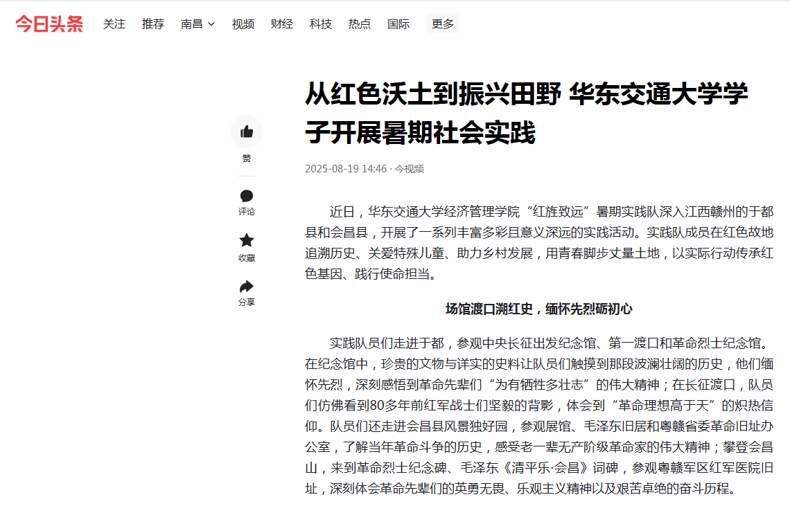 近日,華東交通大學經濟管理學院“紅旌致遠”暑期實踐隊深入江西贛州的于都縣和會昌縣,開展了一系列豐富多彩且意義深遠的實踐活動。實踐隊成員在紅色故地追溯歷史、關愛特殊兒童、助力鄉村發展,用青春腳步丈量土地,以實際行動傳承紅色基因、踐行使命擔當。