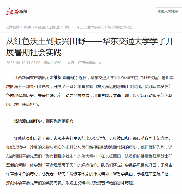 近日,華東交通大學經濟管理學院“紅旌致遠”暑期實踐隊深入于都縣和會昌縣,開展了一系列豐富多彩且意義深遠的暑期社會實踐。實踐隊成員在紅色故地追溯歷史、關愛特殊兒童、助力鄉村發展,用青春腳步丈量土地,以實際行動傳承紅色基因、踐行使命擔當。