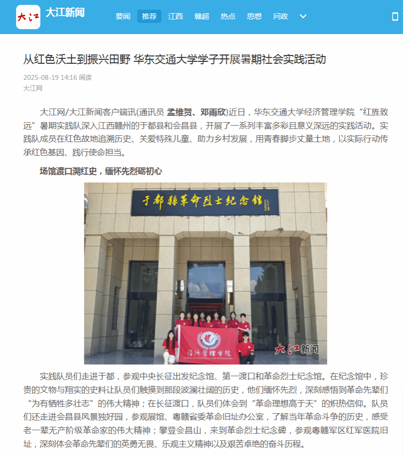 近日,華東交通大學經濟管理學院“紅旌致遠”暑期實踐隊深入江西贛州的于都縣和會昌縣,開展了一系列豐富多彩且意義深遠的實踐活動。實踐隊成員在紅色故地追溯歷史、關愛特殊兒童、助力鄉村發展,用青春腳步丈量土地,以實際行動傳承紅色基因、踐行使命擔當。