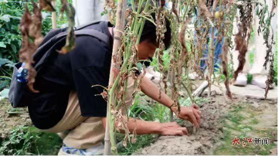 一個多月前,胡志華種植園的番茄頻遭病害侵襲,植株大面積枯死,導致其持續虧損。恰好來到雙溪鎮開展暑期三下鄉活動的華東交通大學“火車頭”世紀英才1班社會實踐隊得知這一情況后,隨即前往胡志華的種植園“問診”。 “這樣的情況有多久了?”“作物一般有什么表現?”到達種植園后,實踐隊隊員馬上展開調研,通過觀察植株、葉片、土壤等,在“望聞問切”中詳細了解番茄種植現狀及當前面臨的困難。