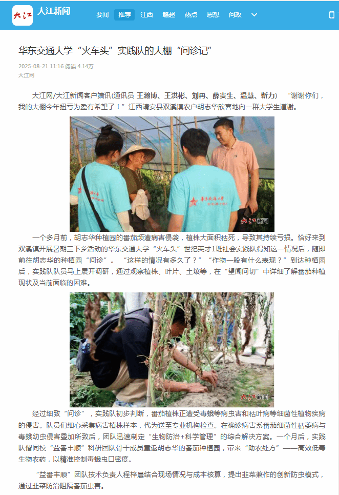 從校園到大棚,從書本到實踐,這場持續一個月的“問診”,不僅幫農戶解決了實際問題,更生動詮釋了知識的力量。未來,實踐隊將繼續發揮橋梁紐帶作用,暢通訴求反映通道,第一時間將調研實情與農民心聲向上傳遞,凝聚社會合力紓解難題,以務實行動回應鄉親們的“急難愁盼”,為繪就鄉村全面振興壯美畫卷貢獻青春智慧和力量。