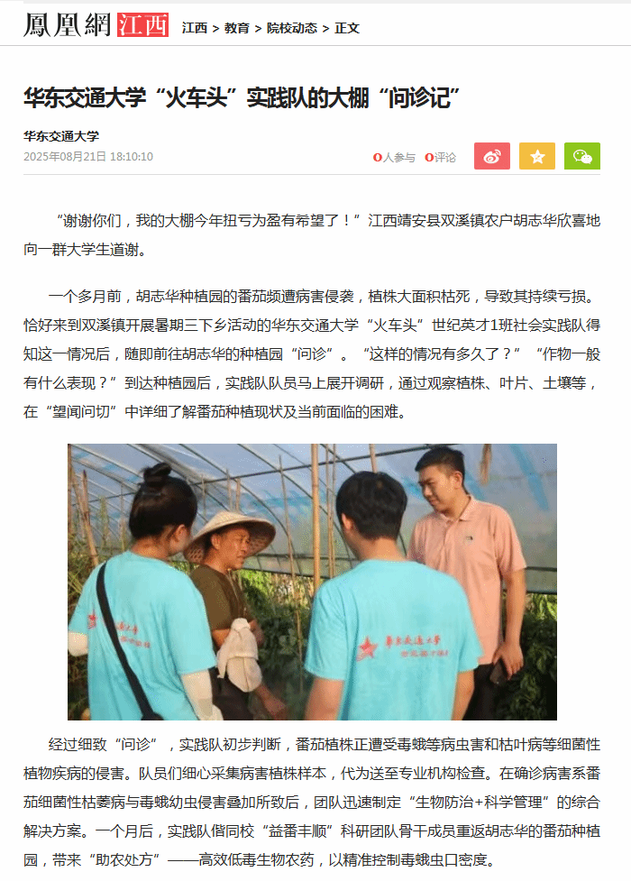 從校園到大棚,從書本到實踐,這場持續一個月的“問診”,不僅幫農戶解決了實際問題,更生動詮釋了知識的力量。未來,實踐隊將繼續發揮橋梁紐帶作用,暢通訴求反映通道,第一時間將調研實情與農民心聲向上傳遞,凝聚社會合力紓解難題,以務實行動回應鄉親們的“急難愁盼”,為繪就鄉村振興壯美畫卷貢獻青春智慧和力量。