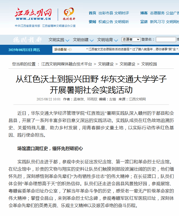 近日,華東交通大學(xué)經(jīng)濟(jì)管理學(xué)院“紅旌致遠(yuǎn)”暑期實(shí)踐隊(duì)深入贛州的于都縣和會昌縣,開展了一系列豐富多彩且意義深遠(yuǎn)的實(shí)踐活動。實(shí)踐隊(duì)成員在紅色故地追溯歷史、關(guān)愛特殊兒童、助力鄉(xiāng)村發(fā)展,用青春腳步丈量土地,以實(shí)際行動傳承紅色基因、踐行使命擔(dān)當(dāng)。