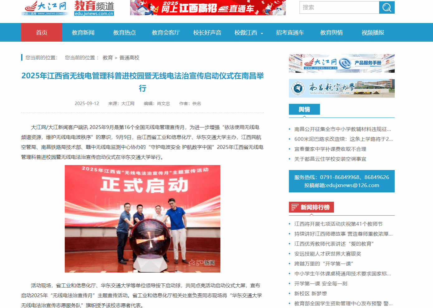 2025年9月是第16個全國無線電管理宣傳月,為進一步增強“依法使用無線電頻譜資源,維護無線電電波秩序”的意識,9月9日,由江西省工業(yè)和信息化廳、華東交通大學主辦,江西民航空管局、南昌鐵路局技術部、贛中無線電監(jiān)測中心協(xié)辦的“守護電波安全 護航數(shù)字中國”2025年江西省無線電管理科普進校園暨無線電法治宣傳啟動儀式在華東交通大學舉行。