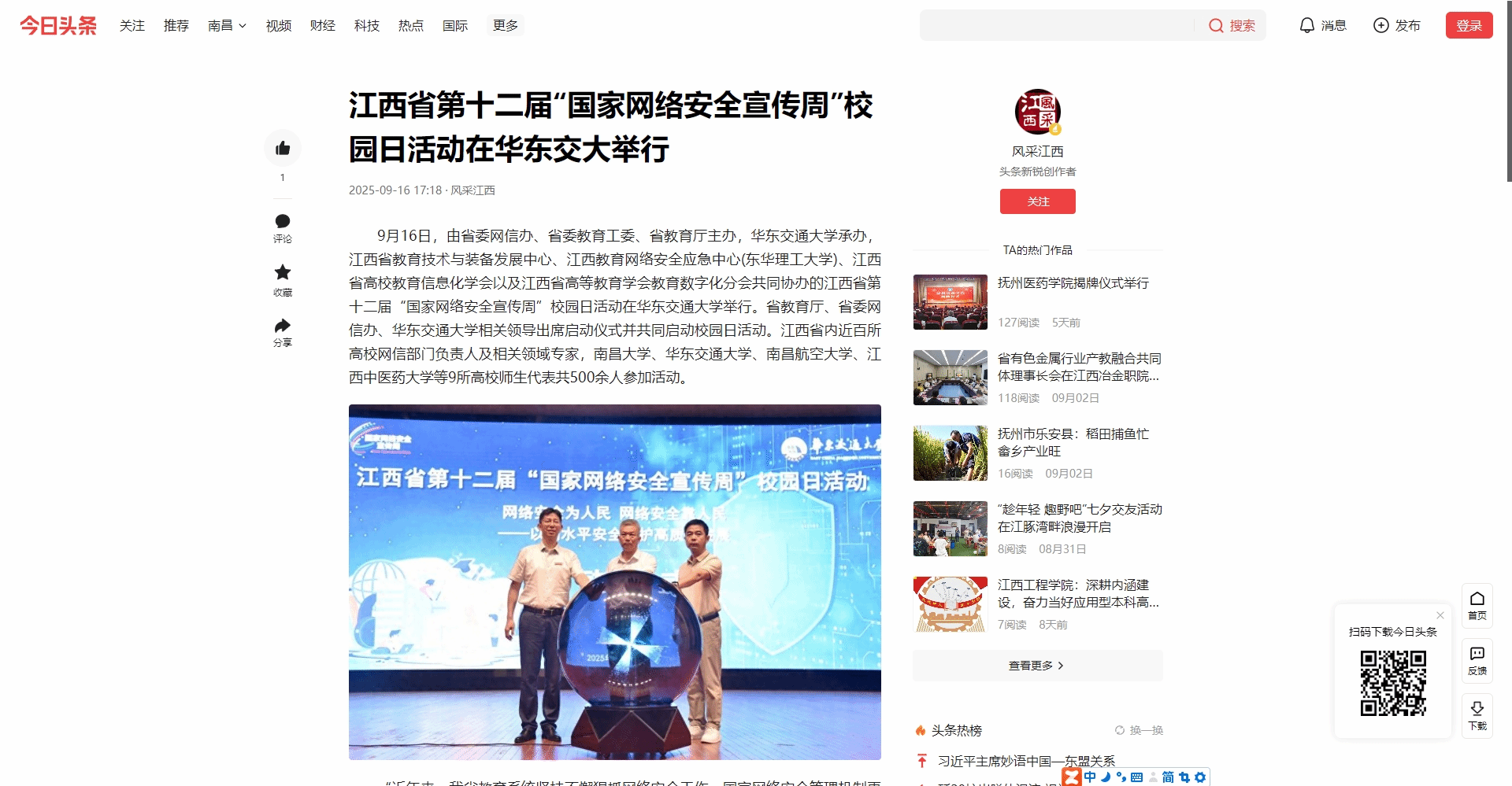 “國家網(wǎng)絡(luò)安全宣傳周不僅是一次對‘網(wǎng)絡(luò)安全無小事’的集中強(qiáng)調(diào),更是一場面向全體師生的‘安全素養(yǎng)提升行動’”,華東交通大學(xué)黨委委員、副校長劉志敏說,希望廣大師生積極投身宣傳周的各項(xiàng)活動,主動學(xué)習(xí)、主動傳播網(wǎng)絡(luò)安全知識,攜手筑牢校園網(wǎng)絡(luò)安全“防火墻”,共同守護(hù)安全、穩(wěn)定、和諧的校園網(wǎng)絡(luò)家園。
