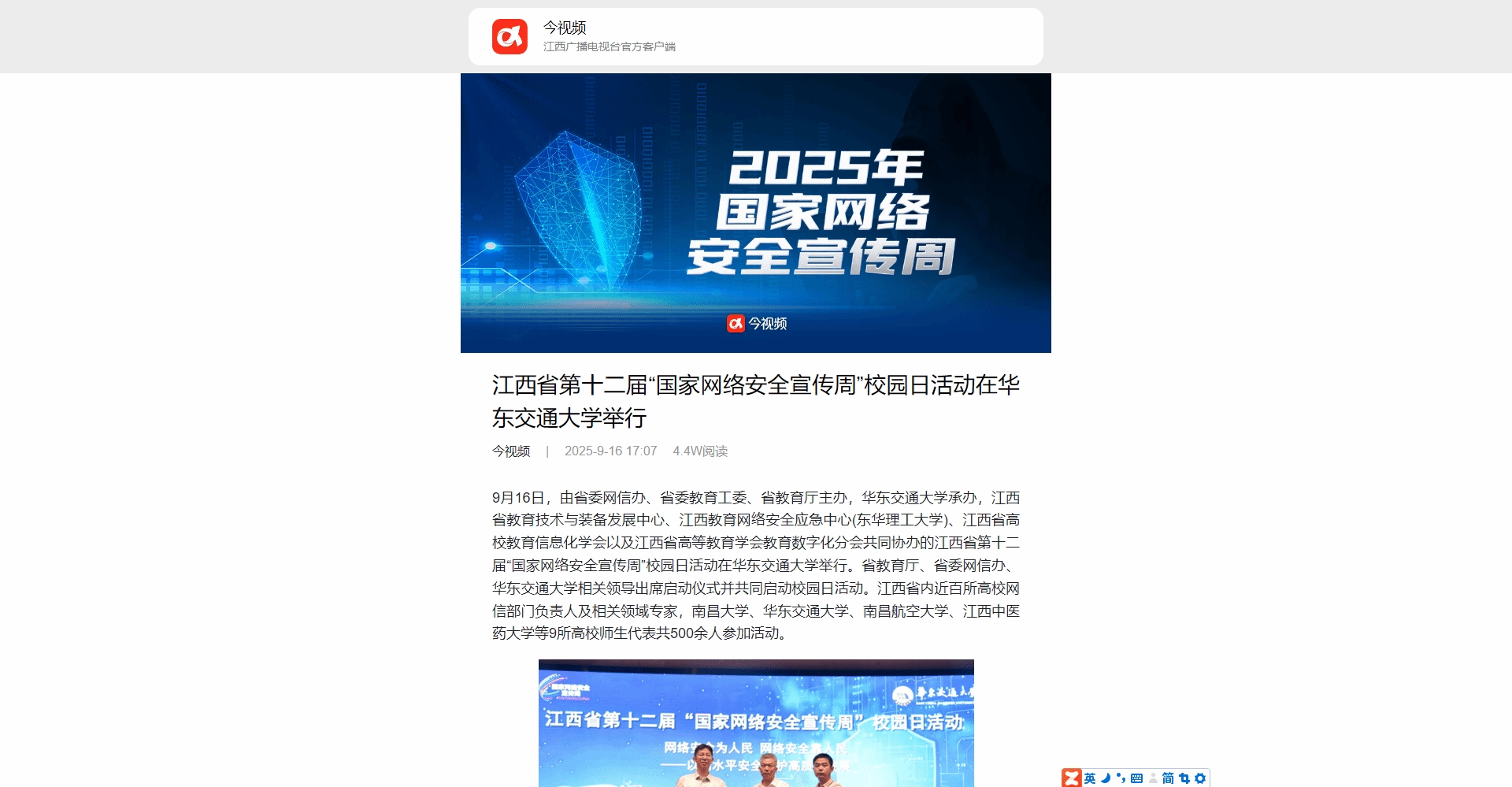 9月16日,由省委網信辦、省委教育工委、省教育廳主辦,華東交通大學承辦,江西省教育技術與裝備發展中心、江西教育網絡安全應急中心(東華理工大學)、江西省高校教育信息化學會以及江西省高等教育學會教育數字化分會共同協辦的江西省第十二屆“國家網絡安全宣傳周”校園日活動在華東交通大學舉行。省教育廳、省委網信辦、華東交通大學相關領導出席啟動儀式并共同啟動校園日活動。江西省內近百所高校網信部門負責人及相關領域專家,南昌大學、華東交通大學、南昌航空大學、江西中醫藥大學等9所高校師生代表共500余人參加活動。