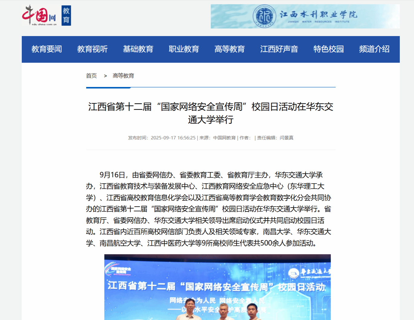 9月16日,由省委網信辦、省委教育工委、省教育廳主辦,華東交通大學承辦,江西省教育技術與裝備發展中心、江西教育網絡安全應急中心(東華理工大學)、江西省高校教育信息化學會以及江西省高等教育學會教育數字化分會共同協辦的江西省第十二屆“國家網絡安全宣傳周”校園日活動在華東交通大學舉行。省教育廳、省委網信辦、華東交通大學相關領導出席啟動儀式并共同啟動校園日活動。江西省內近百所高校網信部門負責人及相關領域專家,南昌大學、華東交通大學、南昌航空大學、江西中醫藥大學等9所高校師生代表共500余人參加活動。