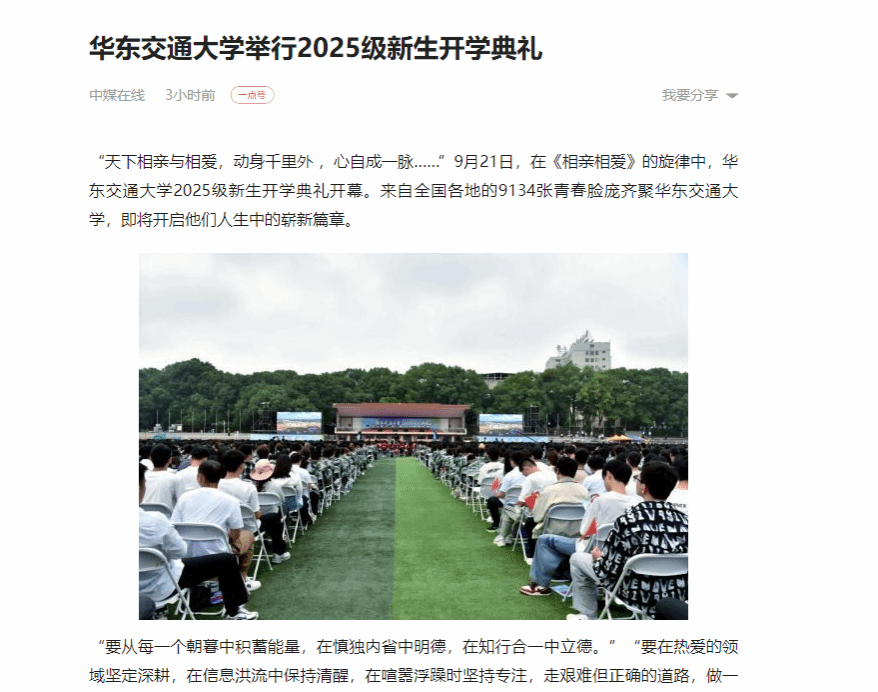 “天下相親與相愛,動身千里外 ,心自成一脈……”9月21日,在《相親相愛》的旋律中,華東交通大學2025級新生開學典禮開幕。來自全國各地的9134張青春臉龐齊聚華東交通大學,即將開啟他們人生中的嶄新篇章。