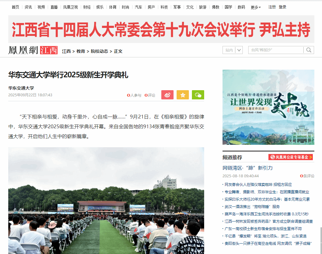 “天下相親與相愛,動身千里外,心自成一脈……”9月21日,在《相親相愛》的旋律中,華東交通大學2025級新生開學典禮開幕。來自全國各地的9134張青春臉龐齊聚華東交通大學,開啟他們人生中的嶄新篇章。